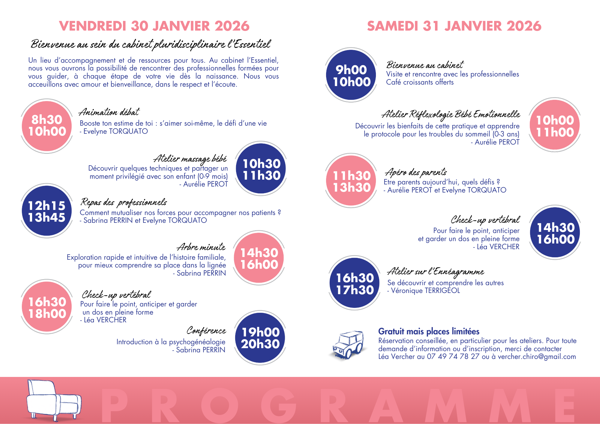 Cliquez ici pour consulter le programme en détail (ateliers sur nos différentes disciplines, visites du cabinet, échanges et moments conviviaux autour d’un café…)